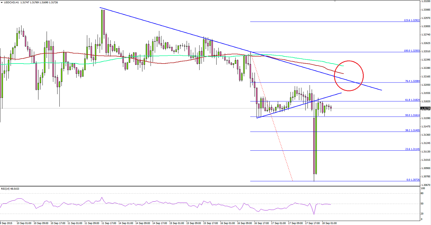 USDCAD Technical AnalysisThe US Dollar was seen trading in a downtrend against the Canadian Dollar, and after yesterday’s release of the Fed interest rate decision, the USDCAD pair came under pressure. There was a nasty downside move noted, taking the pair towards 1.3080.USDCADThere was a bullish trend line formed on the hourly chart of the USDCAD pair, which was breached for losses. There is another bearish trend line formed, i.e. waiting to act as a hurdle for buyers if the pair moves higher from the current levels.Moreover, the pair is also below the 100 and 200 hourly simple moving average, which is a negative sign for buyers in the near term.Canadian CPIToday, there is a major release lined up in Canada, as the Consumer Price Index (CPI), which is a measure of price movements by the comparison between the retail prices of a representative shopping basket of goods and services will be published by the Statistics Canada. The forecast is lined up for no change in the CPI in August 2015, compared with the preceding month. This is on the lower side, as there as an increase of 0.1% last time.Moreover, in terms of the yearly change, the CPI is forecasted to increase by 1.3% in August 2015, compared with the same month a year ago and is same as the last time.Let us see how the outcome shapes up and whether it helps the USDCAD pair in the near term or not.Chinese Housing Price IndexEarlier during the Asian session, the housing price index, which is a key indicator for economy, as rising prices usually encourages new construction was released by the National Bureau of Statistics. The outcome was mixed as there was a decline of 2.3% in August 2015.