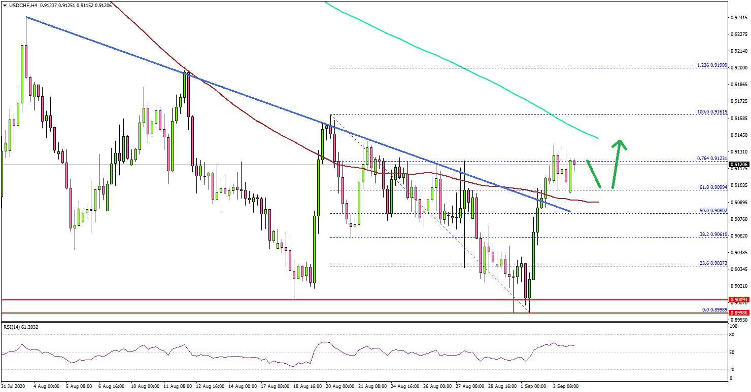 However, the pair is likely to face a strong resistance near the 0.9150 level and the 200 simple moving average (green, 4-hours), above which it could revisit the 0.9200 zone. If it fails to continue higher, there are chances of a fresh dip towards 0.9020.