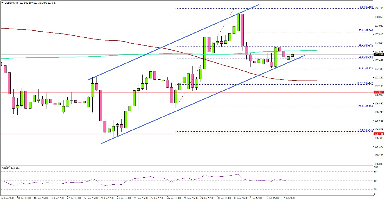 - A key rising channel is forming with support near 107.40 on the 4-hours chart.