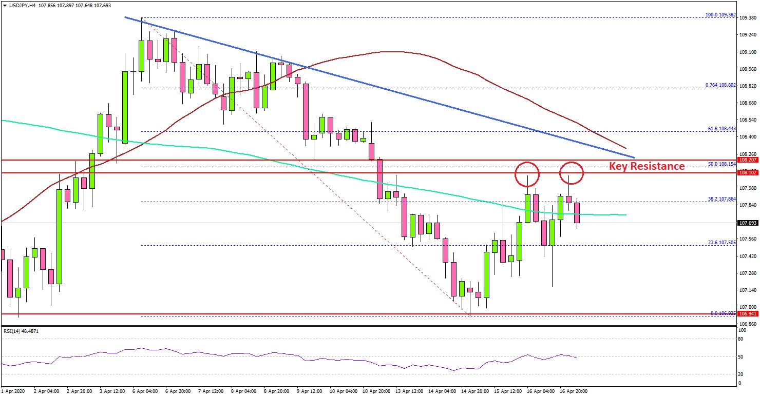 However, the pair faced a strong resistance near the 108.00 area. It also failed to test the 50% Fib retracement level of the last key decline from the 109.38 high to 106.92 low.