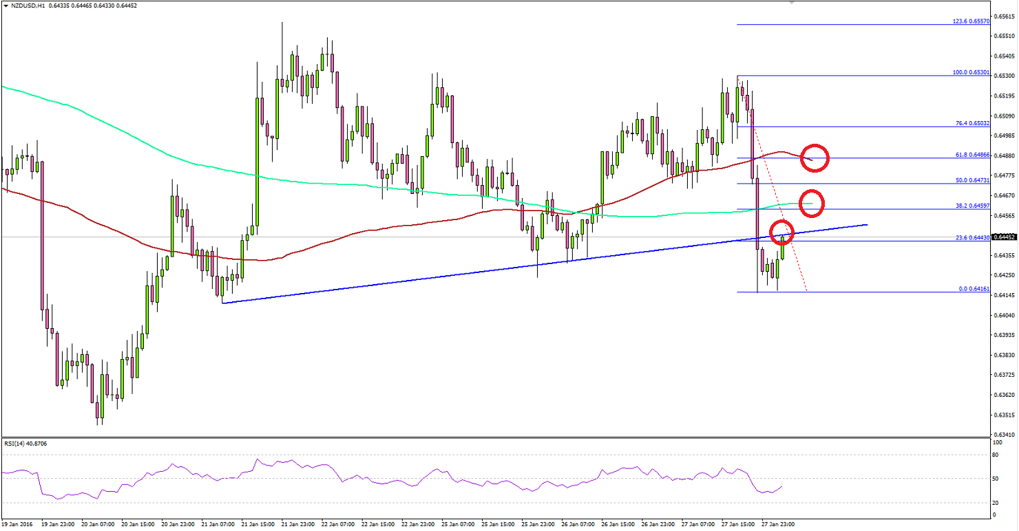 The pair traded as low as 0.6410, and after the release of the Trade Balance report, the NZDUSD pair gained bids.However, the broken trend line is now acting as a resistance and preventing gains. It looks like the pair may break it to move higher, but might face sellers once again near the 0.6460 level. The 200 hourly simple moving average is positioned around the stated level.
