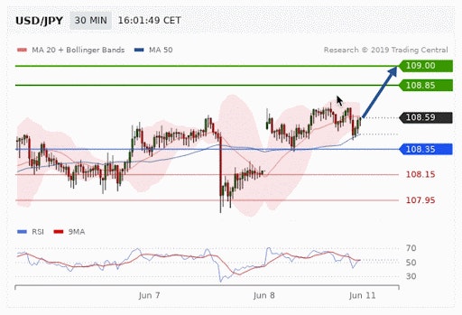 Here we are looking at a signature chart by Trading Central. There may be indicators, patterns or trend lines plotted on the price chart. This gives you a glimpse into the technical analysis methodology, but let’s focus on the output.