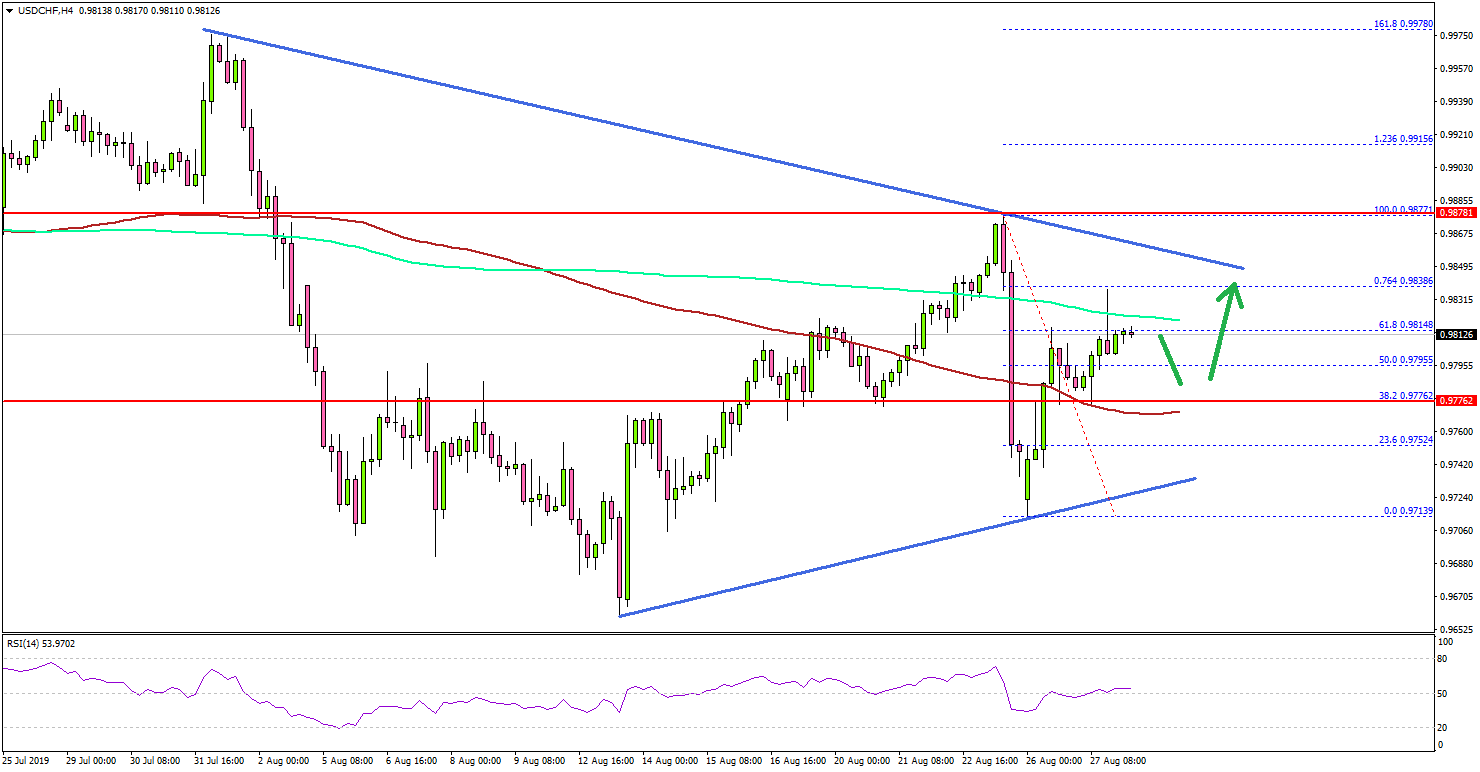 This past Friday, the US Dollar declined sharply from 0.9880 against the Swiss Franc. However, the USD/CHF pair remained supported above 0.9700 and recently started a solid upward move.