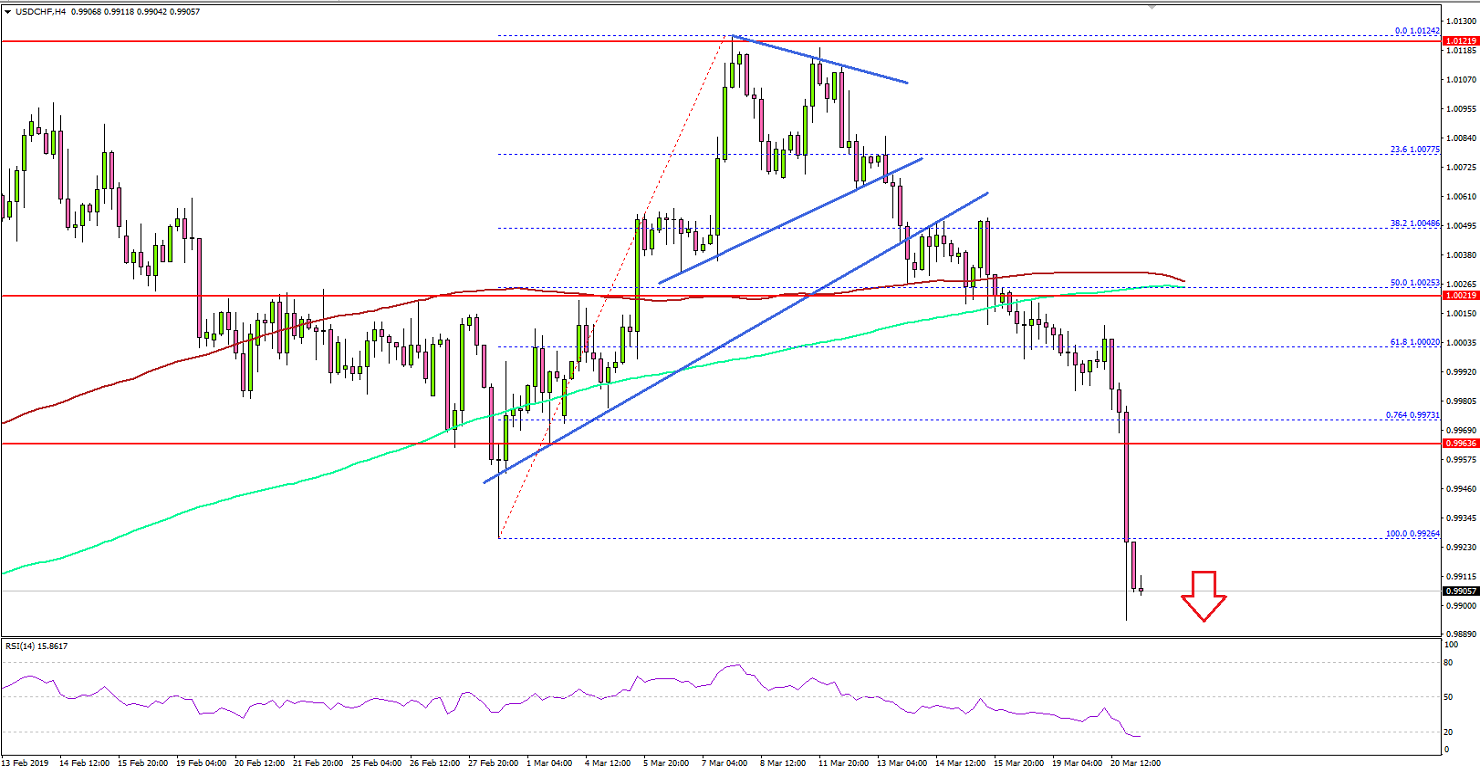 Looking at the 4-hours chart, the pair topped at 1.0124 and later declined below the 1.0080 and 1.0050 support levels. The recent decline was strong as the pair broke the 61.8% Fib retracement level of the last wave from the 0.9926 low to 1.0124 high.There was a break below a key bullish trend line with support at 1.0045. Besides, the pair declined below the 1.0000 support, the 200 simple moving average (green, 4-hours), and 100 simple moving average (red, 4-hours).Clearly, the pair is trading in a bearish zone and it broke a few important supports near 0.9950. If sellers clear the 0.9900 support level, there is a risk of an extended drop towards 0.9880 or 0.9865.On the upside, the previous support near 0.9980 and the 100 SMA are likely to act as hurdles if the pair starts a recovery from the current levels.Looking at the other major pairs, EUR/USD extended gains above the 1.1320 level and GBP/USD seems to be facing a strong resistance near the 1.3300 zone.Economic Releases to Watch Today